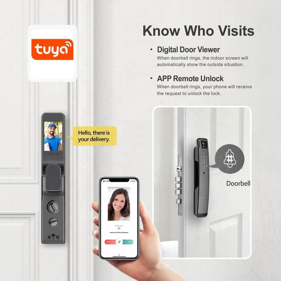 The Wifi door lock with a camera is automatically locked by Mobile App. -Internal monitoring “cat-eye” design When the guest presses the doorbell, the indoor monitor with a 180° camera can see who is the visitor and make the home safer. It has a simplified appearance design, adopts a strong and corrosion-resistant aluminum alloy panel, and the thickness of the gate is 40-80mm. This Wifi door lock with a camera can be widely used for wooden and security doors, complicated with 6068 mortises.